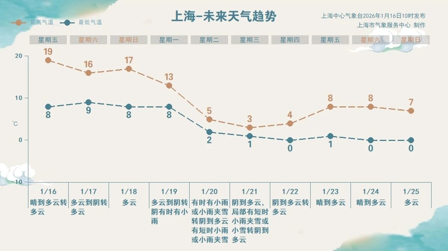 气温方面,今天白天上海以晴到多云为主,气温与昨天相近,预计最高气温在19℃,早晚冷、白天暖,及时调整衣着。