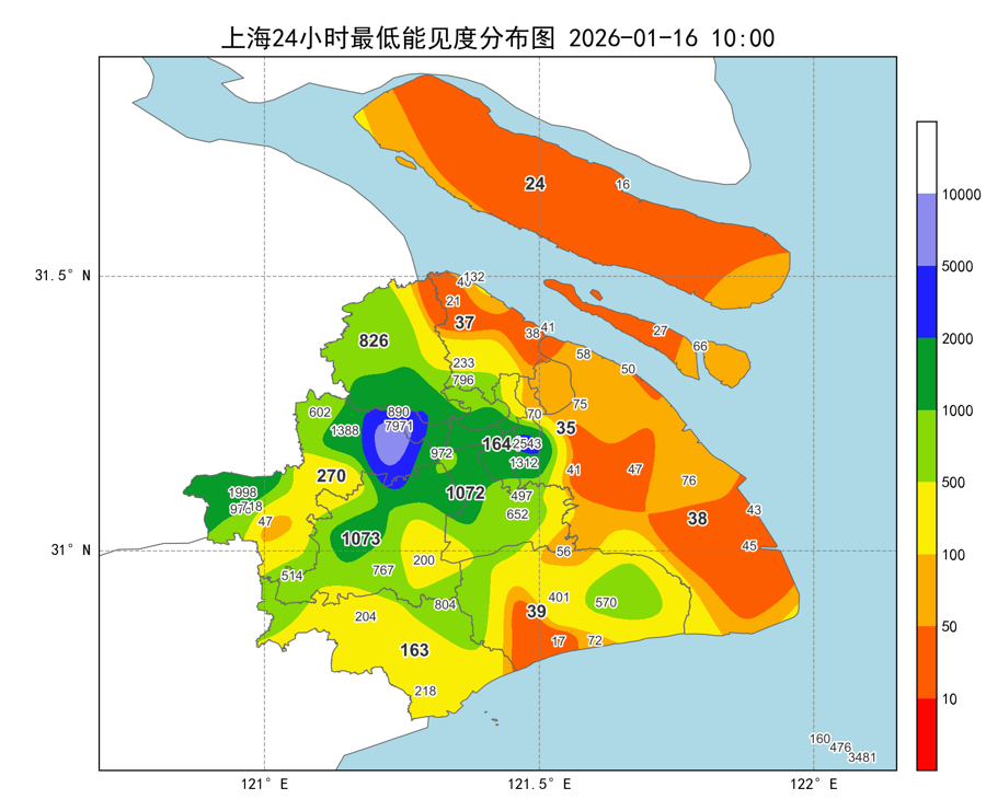 根据上海中心气象台发布的数据,昨天夜间到今天早晨,本市大部地区出现能见度小于500的雾,崇明局部地区瞬时能见度一度只有50米左右,崇明发布大雾红色预警信号。上海中心气象台于凌晨5时06分发布本市大雾黄色预警信号。